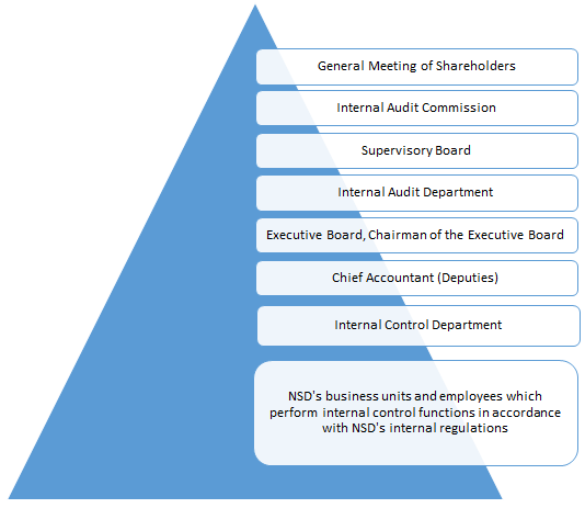 Internal control bodies and officers are NSD's management bodies, business units, and employees (responsible officers), as determined by NSD's Articles of Association and internal regulations, which perform certain functions as part of the internal control system.