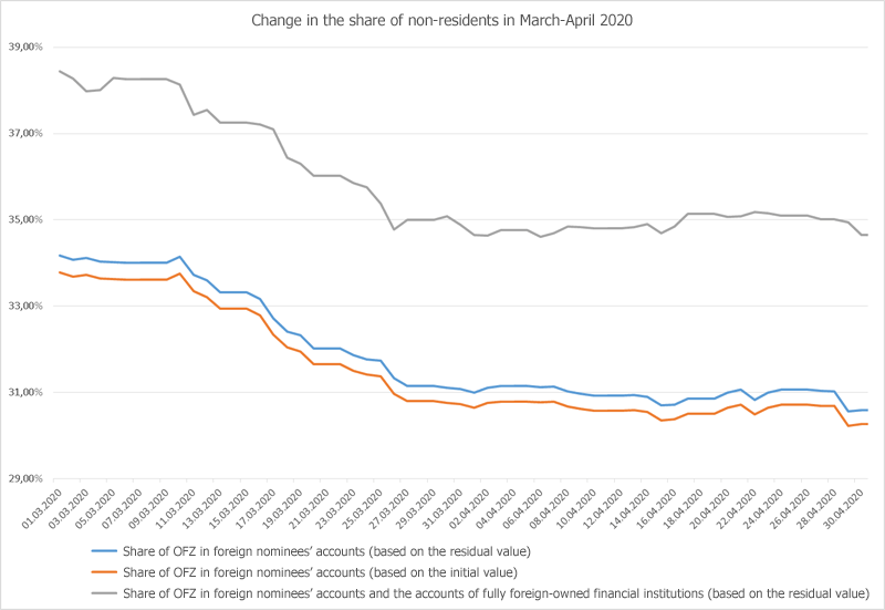 Meanwhile, on 30 April 2020, the share of OFZ in foreign nominees’ accounts and the accounts of fully foreign-owned financial institutions* equaled to 34.65% (based on the current nominal value).