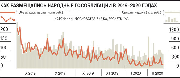 Минфин заинтересован в расширении предложения народных облигаций. Еще в 2018 году тогда премьер Дмитрий Медведев поручил увеличить объем размещения ОФЗ-н до 100 млрд руб. в год. Однако за четыре последних месяца прошлого года размещена лишь половина четвертого выпуска на 7,7 млрд руб. За неполные два месяца этого года размещены облигации пятого выпуска всего на 1,1 млрд руб. Между тем госбанки размещают среди частных инвесторов собственные облигации на 3–5 млрд руб. порой за один день.