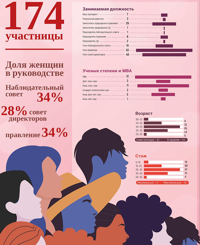 Согласно исследованию Deloitte, в России и в мире увеличилось, хоть и незначительно, количество женщин, входящих в советы директоров или занимающих руководящие должности. Чаще всего женщины-руководители работают в сферах, близких к здравоохранению (21,3%), финансам (21,2%) и торговле (20,8%). Исследование McKinsey&Company показывает, что, несмотря на бОльшую долю женщин выпускников (61% против 39% мужчин) и примерно одинаковые доли участия в рабочей силе, доля женщин, занимающих менеджерские и управляющие должности, значительно ниже (37 и 19% соответственно), и только 8% женщин — среди генеральных директоров. Число женщин-лидеров напрямую влияет на рост прибыли: компании, в которых доля женщин-руководителей превышает 30%, могут быть на величину до 48% экономически успешнее организаций, в которых этот показатель составляет до 10%.