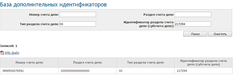 При поиске по счету депо/разделу счета депо, пользователь в ответ получает информацию о ДИ, при поиске по ДИ пользователь получает информацию о счете депо и коде раздела.